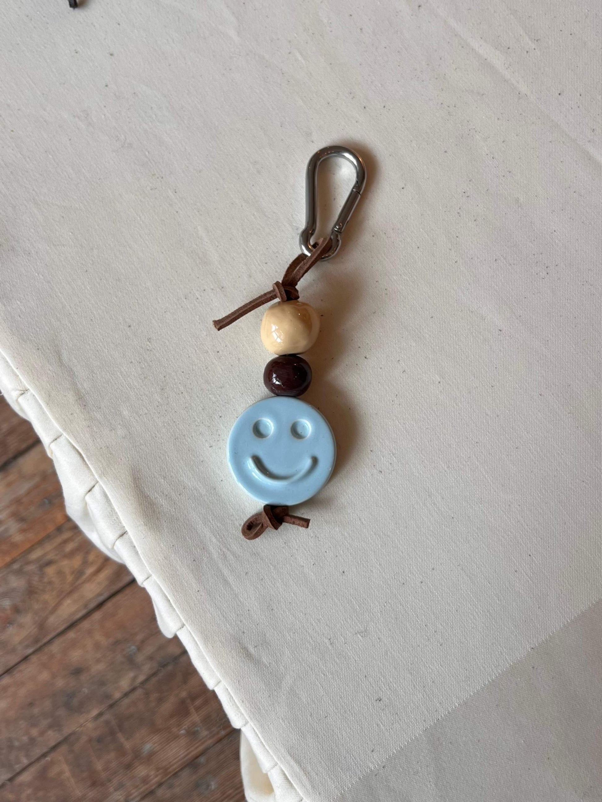 Bring a little joy wherever you go! This cheerful keychain is handmade with care, featuring two handcrafted ceramic beads and a smooth ceramic smiley charm. The beads are strung on a sturdy leather cord and finished with a metal clip, making it easy to attach to your keys, bag, or backpack. Every piece is unique due to its handcrafted — small characteristics make it one-of-a-kind!